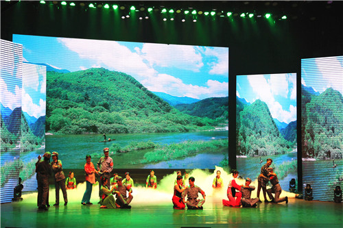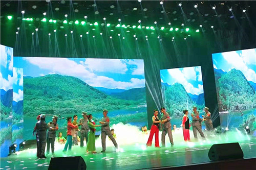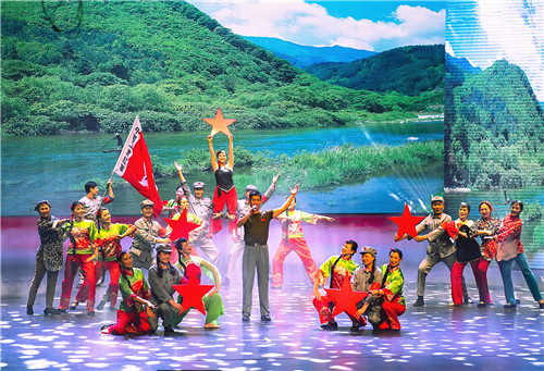 ? ? 9月24日晚,地礦集團公司慶祝中華人民共和國成立70周年《與祖國同行——奮進的地礦人》文藝晚會在西安人民劇院舉行。物化探隊選送的情景歌舞《紅星照我去戰斗》在舞臺上綻放異彩。