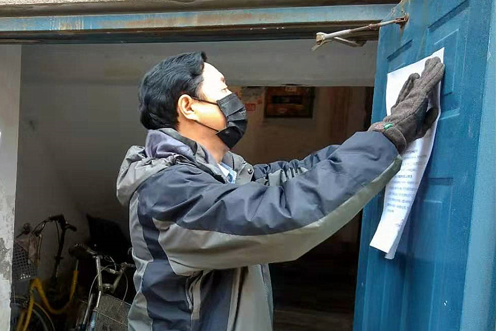 ??? 逐戶排查登記,把《關(guān)于做好新型冠狀病毒感染的肺炎疫情防控工作的緊急通知》送到居住在院內(nèi)的150多戶家中;逐戶摸排登記發(fā)熱、湖北返回、密切接觸感染者等3類人員。對(duì)當(dāng)前疫情防控進(jìn)行宣傳,堅(jiān)信黨的領(lǐng)導(dǎo),不聽謠、不信謠、不傳謠,引導(dǎo)職工眾志成城,抗擊疫情。