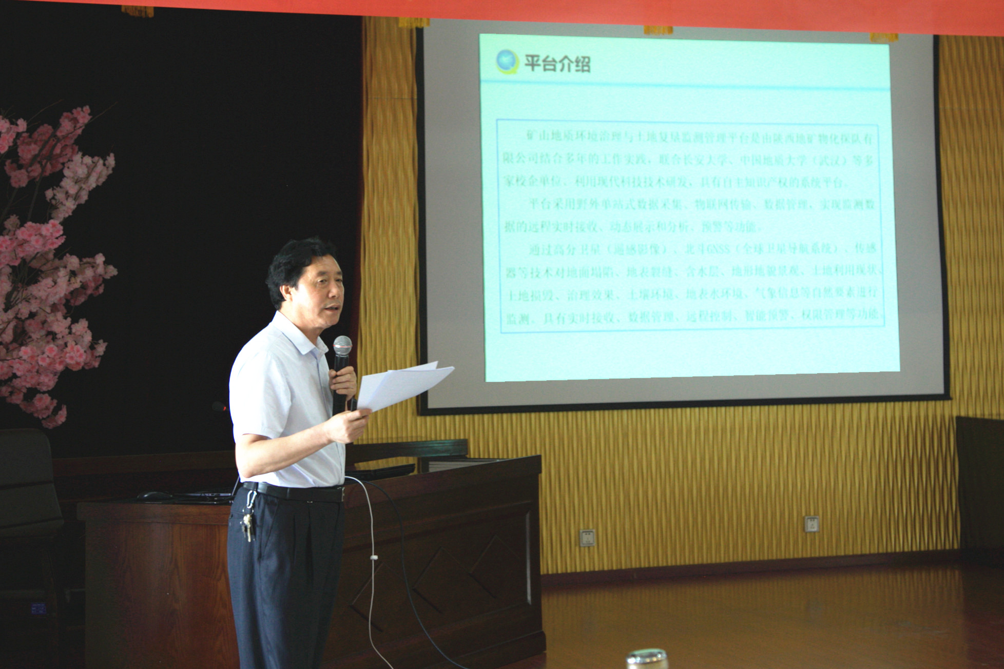 ? ? 物化探隊黨委書記、執行董事、總經理王新坪從礦山地質環境保護與土地復墾監測管理平臺、系統架構、系統設計、技術體系與核心技術,并結合應用案例做了詳細講解。