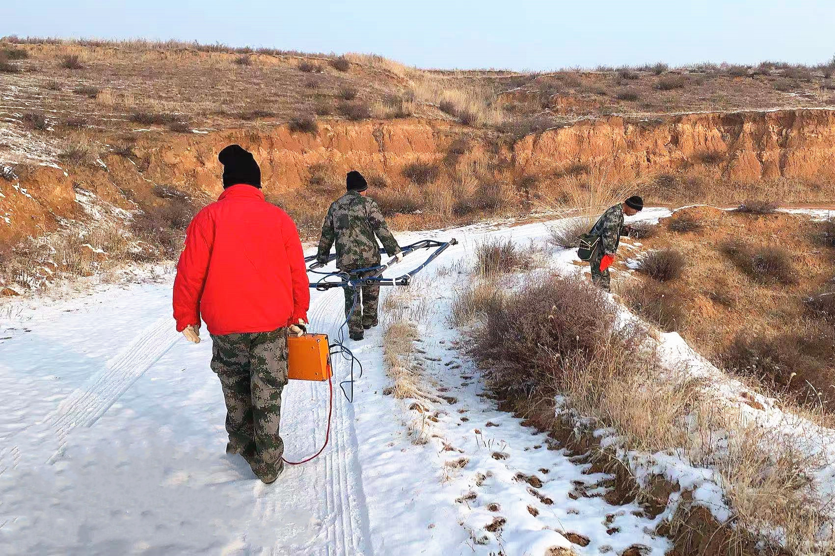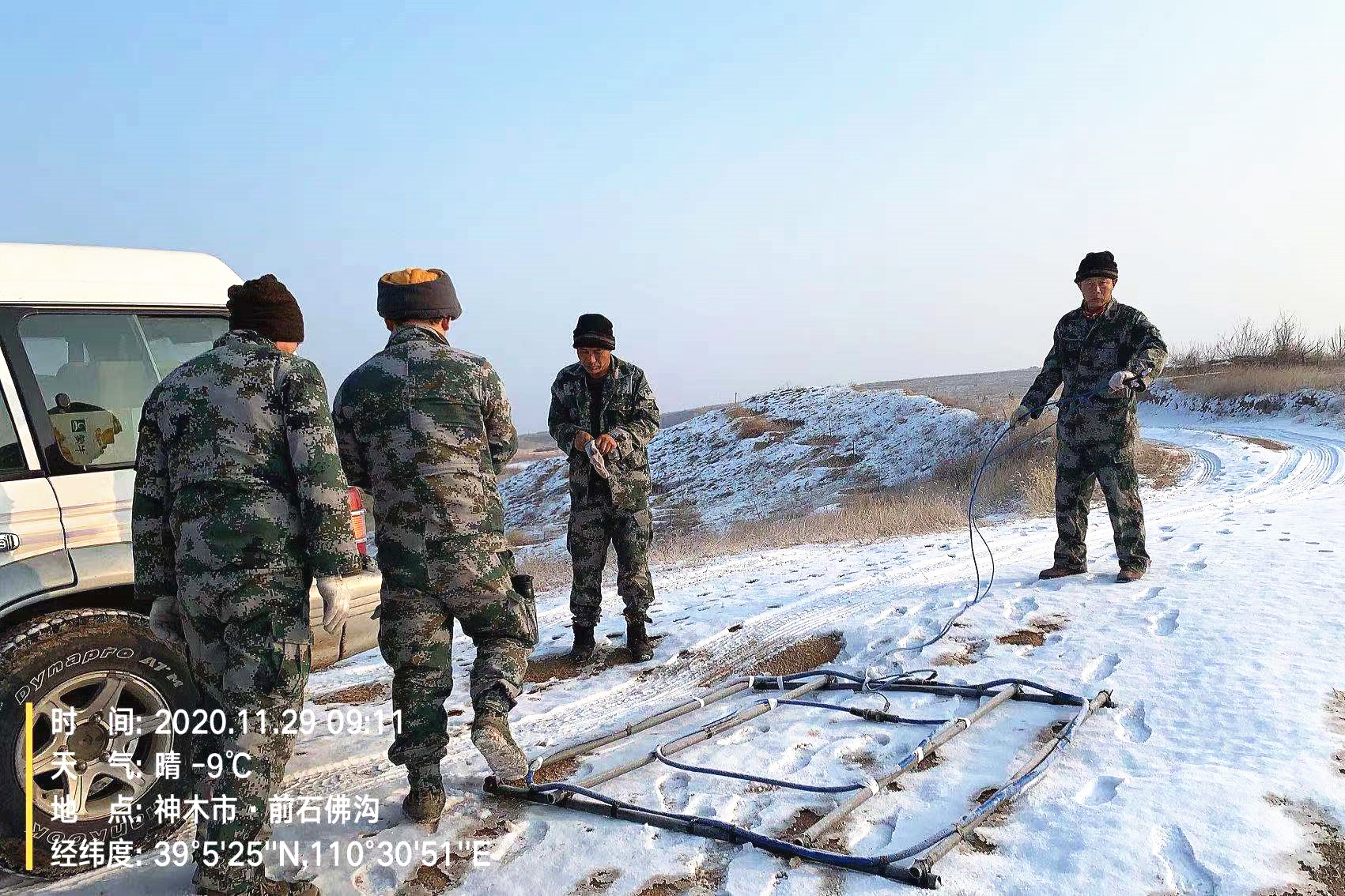 ? ? 工區位于榆林市神木市店塔鎮楊伙盤村,工作面積8.85平方公里。區內溝壑縱橫,天氣較冷,氣溫達到零下12度,給施工帶來很大困難。為盡快完成施工任務,工程物探公司干部勇于擔當、率先垂范,廣大職工甘于吃苦、無私奉獻,克服了低溫帶來的諸多影響,加緊施工,力爭早日完成工作任務。